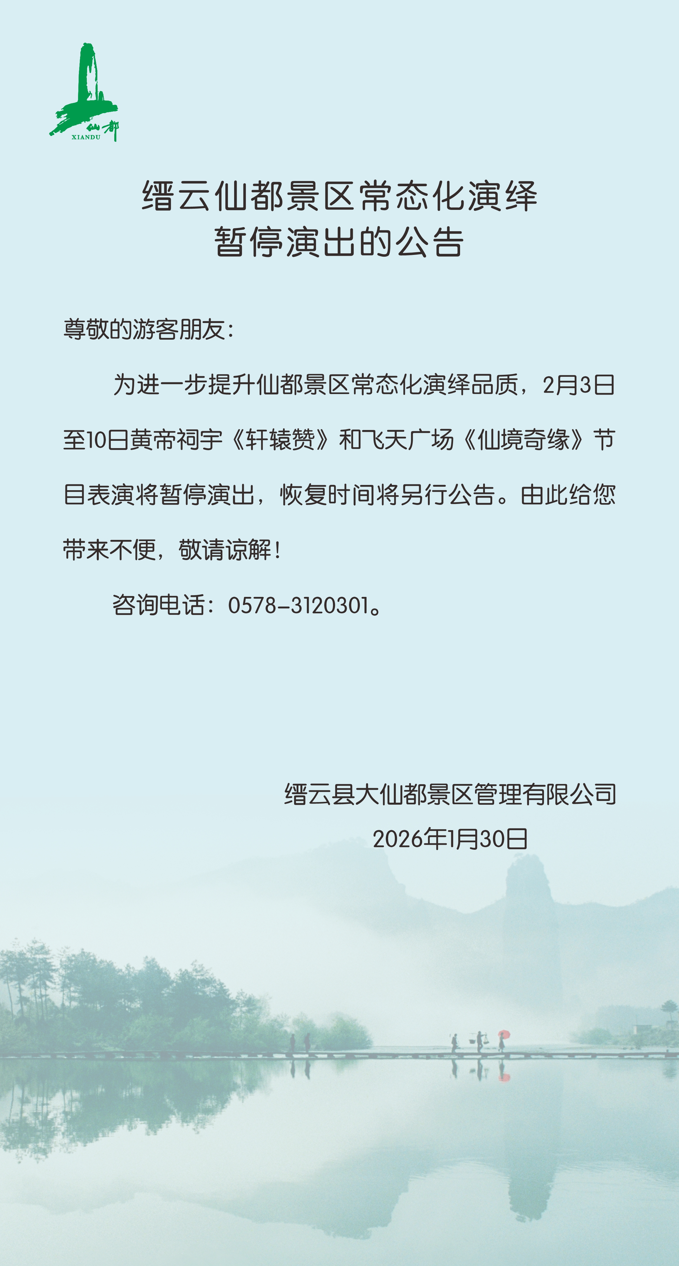 【通告】缙云仙都景区常态化演绎暂停演出的公告