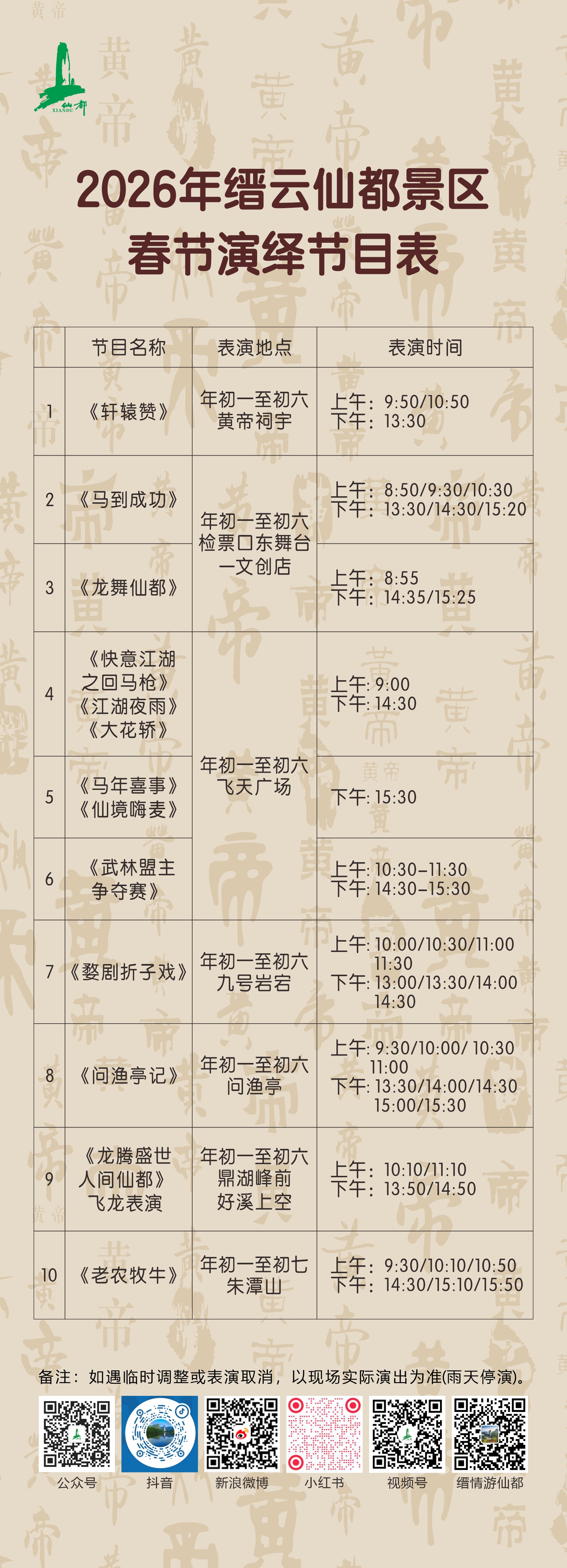 2026年缙云仙都景区春节演绎节目表